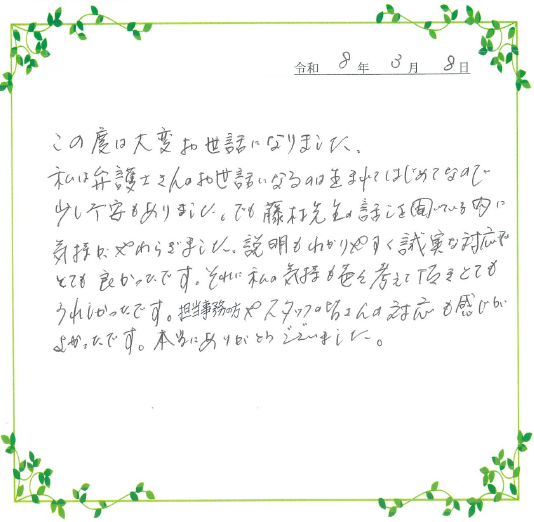 【任意整理】 今回,私の借金問題の解決に全力で尽くして頂き,ありがとうございました。